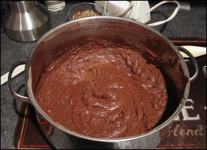 We got the bacon cooked, the pecans toasted, and melted down the chocolate, so all that was left was to mix up the rest of the ingredients.