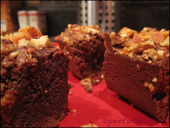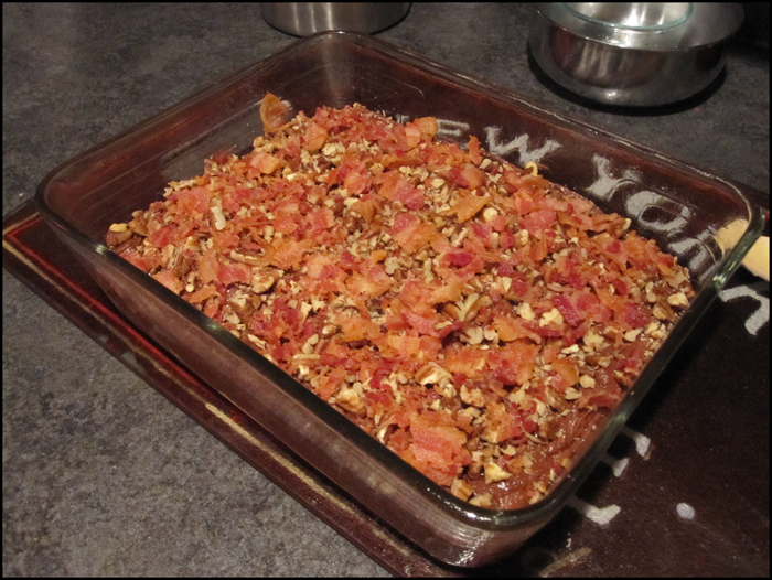 The bacon and the pecans were sprinkled on the top of the brownies before we put them in the oven and we kind of thought that it would have been better to have mixed some of the bacon in with the batter. We are gonna try it that way next time we make them.