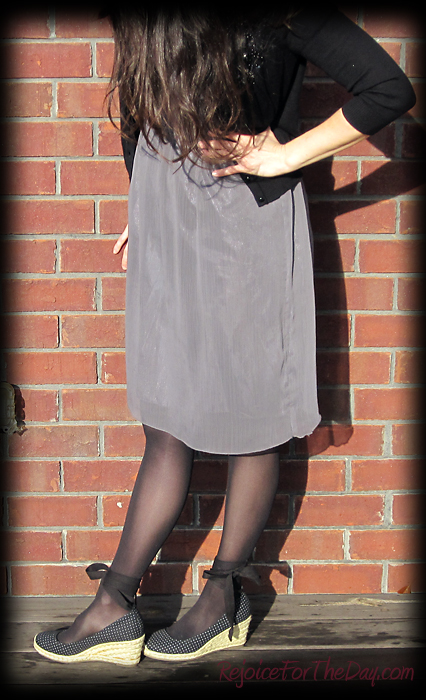 First of all, it is kind of funny how I happened upon these shoes. The brand is Steve Madden and they briefly belonged to my niece. She got them brand new from the Goodwill and wore them to my house one day. I told her I really liked her new shoes. (They were black, polka dot, and wedges, need I say more?) Well, turned out they didn’t really fit her – they were a bit big. (Besides my mom, my oldest niece may be the only one with a shoe size smaller than me! She handles this better than I do.) It was just a compliment, nothing more. My dear friend, her mom, thought that since she had just gotten them and they were too big, she should go ahead and give them to me. My niece agreed, and as far as I could tell, she wasn’t bothered by the decision that was made for her. Before actually accepting them, I did make sure she really didn’t care, because I truly wasn’t trying to take her shoes away. No problems and all ended well! (It’s not like I bullied the shoes away from her, or anything like that…)