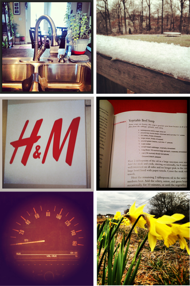 ||1st – typical view on a Friday || 2nd – woke up to snow || 3rd – coming soon || 4th – low-carb dinner || 5th – a night out ||6th – hurry up spring || 7th – the long way home ||
