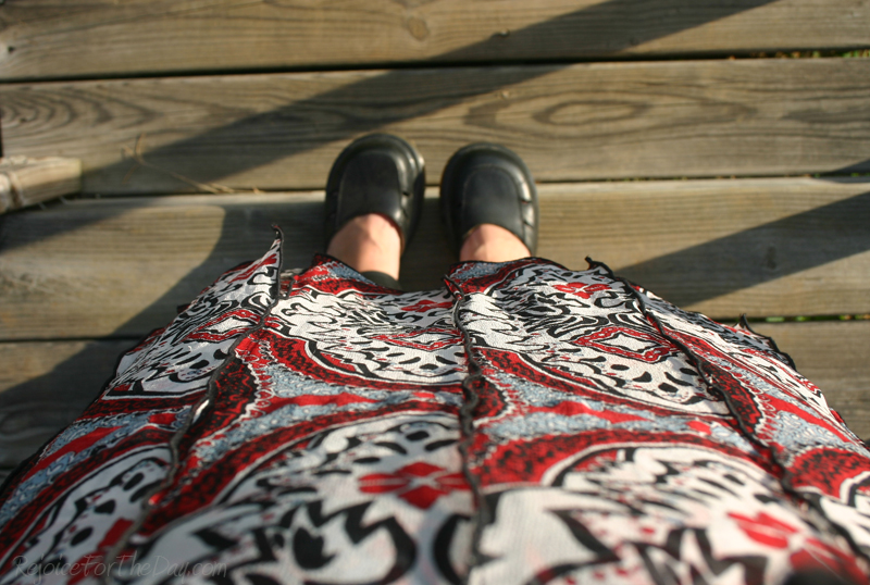 For this week, my thrifted find is this skirt. It is silk and it has these neat little stitched together panels, I guess that’s how I would describe it. I got it at a thrift store in Nashville a few years back, maybe consignment store would be a more appropriate description. It was definitely a high-end thrift store either way. It was kind of boutique-ish – probably not really a word – and they carry only designer-type labels. Things were a bit more pricey than say, my local Goodwill, but what they had would never be in my price range otherwise. It was a nice find, I should go back again someday. The name of the place is Designer Renaissance; it sounds high-end, don’t you think?