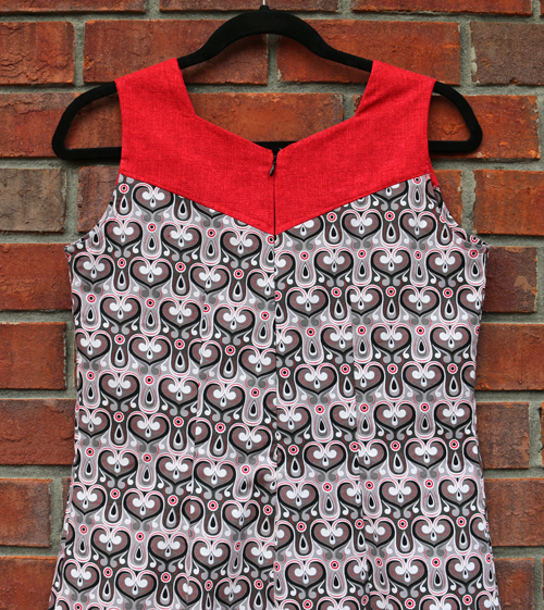 Number 1: I cut the knee length and it was way too short. It seemed more like a tunic length if you ask me. These dresses do usually have a hem band option, but in my experience with others from the designer, without a hem band, the dresses I have made haven’t been this short. Perhaps it had something to do with the shift style. Now that I am thinking about it, shift dresses are usually on the shorter side. I cut 6 inch strips for the hem band that I folded to add to make it longer. As you can see, the band is under that narrow red strip along the bottom.