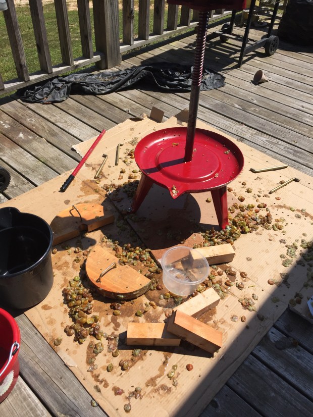 Plant identification done, it was now time to try out the new wine press. I think I like it better than the other one we were using before, but it is more of a mess and takes a lot more clean up. In two weeks, we have gotten better at keeping things cleaner when we use it though.