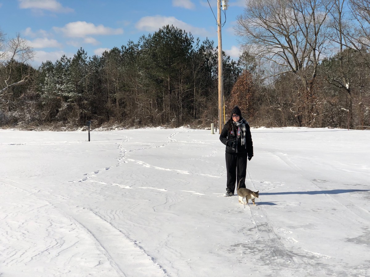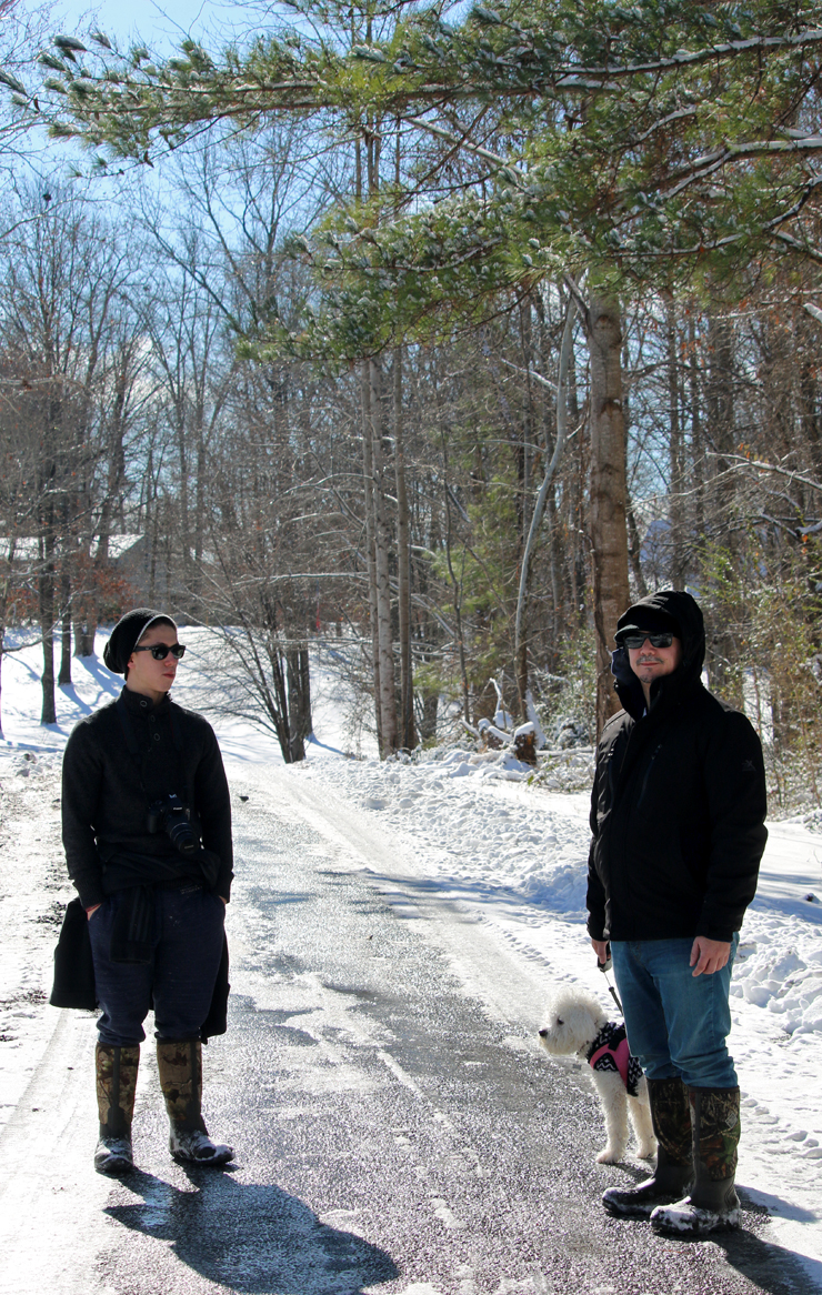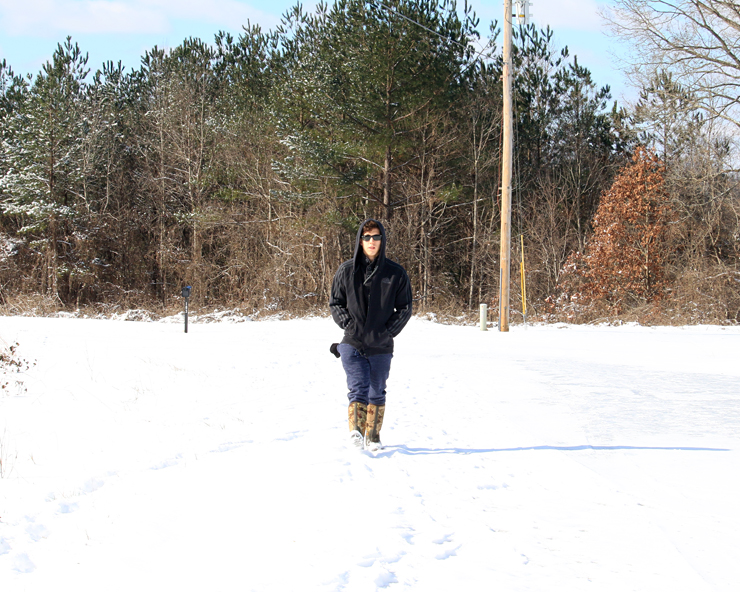 The wind was breezy and the snow was right on top of a nice layer of ice. Only one person had driven down our road, the mailman, and the tracks were mostly covered. We all did our best not to slip and fall. I was only worried about myself. I was wearing my boy’s tennis shoes because they were the only thing I could get my feet into with multiple pairs of thick socks. They were a little big. (Note to self, get some Muck boots next winter.)