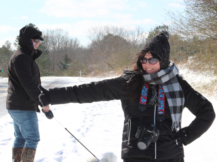 I walked just a bit further and was done, took a few pictures of the boy on my way back, and we started to make our way home. Just seconds after we turned off the main highway, the TDOT snowplow came barreling down the road scraping and spraying everything off to where we had just been walking. Had I taken any longer, we would have been pelted by a wave of dirty snow and ice. We even had to turn our backs to keep from getting hit from where we were standing a bit off of the road. I’m glad I didn’t go further.