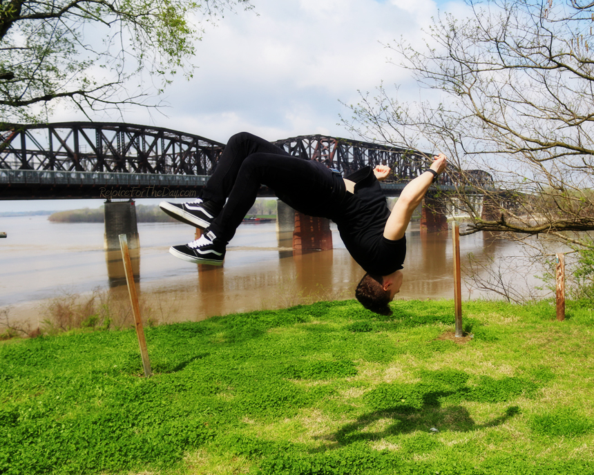And look at that, an awesome bridge view! This particular day was wonderful: spring was showing and the weather was perfect. We went into tourist mode, gathered up the camera stuff and headed for a walk through the park. For my boy and me, no walk is complete without at least a picture or two of him doing flips. So we had to get those in, especially with a cool bridge in the background!