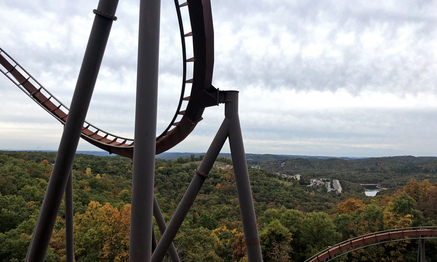 From here, it was time for the amusement park. We’ve done Silver Dollar City every time we’ve come and even though I’ve ridden the roller coasters many times before, I always go in with a bit of anxiety about riding said roller coasters. There was a new one this time, the Time Traveler. We did it first and did it two times in a row. Once the ride was done, it was awesome. In fact the best ride of the day! It’s a rotating roller coaster; the world’s fastest, tallest, spinning roller coaster. Does it go upside down? I asked my guy. No, I don’t think so, he says. So I feel like I am a little bit more at ease before nervously getting on the ride. Then it takes off and drops us while spinning, and does in fact go upside down. I didn’t open my eyes the first time, and then did briefly the second time around. Like I said, I like the rides much more after they are over and I know I survived. My nervousness doesn’t keep me from riding the the others though. Bad idea today.