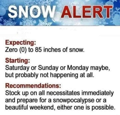 It wasn’t all snow and cold though. A few days it started off nice then went straight to winter by dinner again. The above caption is a pretty accurate one. For example, this coming Monday was calling for 1-3 inches of snow last night, then this morning nothing. Go figure!