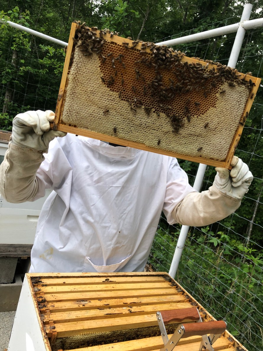 Also today we checked bee hives because after the last check we thought we’d be in the need for honey supers, boxes to just collect honey in. We were right. The busy bees have filled up most all the frames and what you see above is capped and uncapped honey. There’s lots of it! Oh, and lots of bees! Also, way too many mosquitoes. (Another reason the time outdoors is going to be a little less often.)