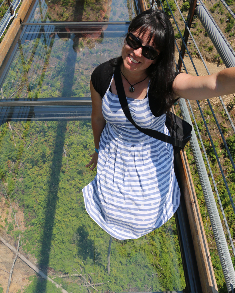 We got to the top, wandered briefly though the gift shop, then out to the bridge.  It was pretty neat.  Maybe not as big as I thought it would be, but still a bigger than I am used to bridge nonetheless.  Did I mention it was a suspension bridge?  And, did I mention that the center of it was floored with glass?  This was the exciting part.  I wasn’t nervous at all until that first step on to the glass.  Then, it was really cool.  Even though there were lots of people around, the bridge was not that crowded and everyone was nice enough to give you a minute or two for pictures on the glass.  You could definitely feel the bridge moving as you walked along, but it wasn’t anything none of us couldn’t handle.  🙂