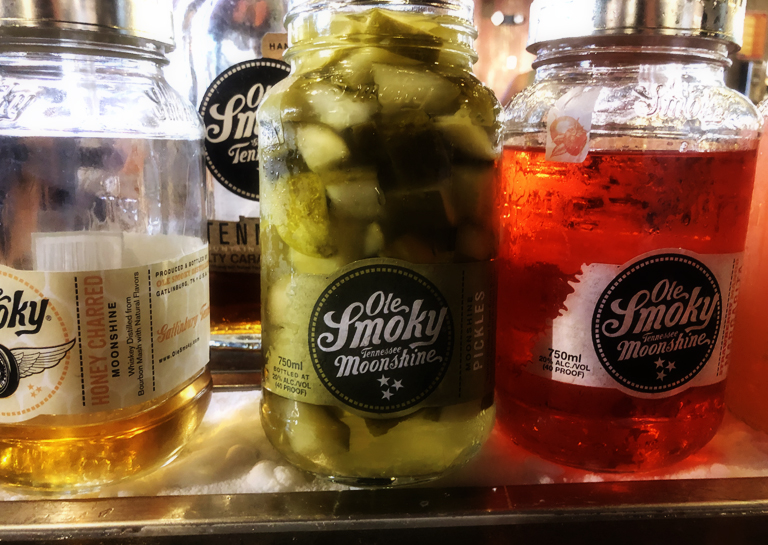 You can pay $5 for a tasting, oh, and there was a waiting line.  It was a little more exciting than a regular ole wine tasting that I am used to, actually It’s almost like an attraction in itself.  The bartenders – is that what you’d call them – are entertaining and you get to sample a nice selection of what is available, even including moonshine pickles!