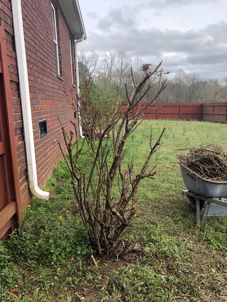 I have good news though, it finally quit raining! Brief moments of sun shined though earlier in the week and I took advantage of the time to do a little finishing touches on my recently trimmed rose bush. Please don’t laugh at how it looks. I have no clue how a pruned rose bush should look and last week I told my nephew to just do what he thought needed to be done to it to keep it from looking overgrown. He did a great job, but I thought that the center could be thinned out a bit more, and I couldn’t leave well enough alone. So here it is now. And here it was last May. We shall soon see how it will look this growing season…