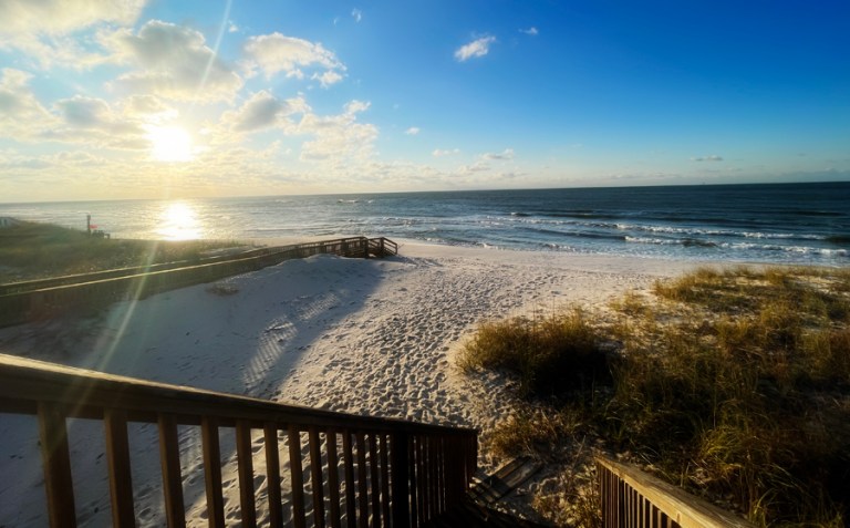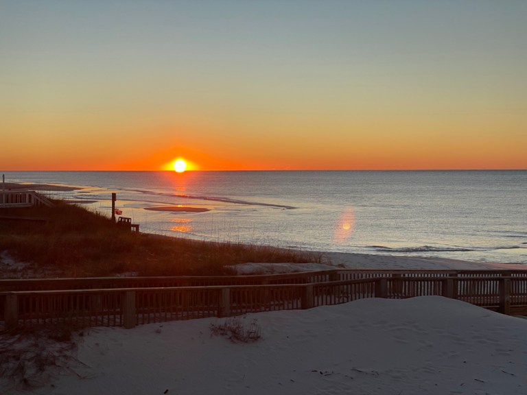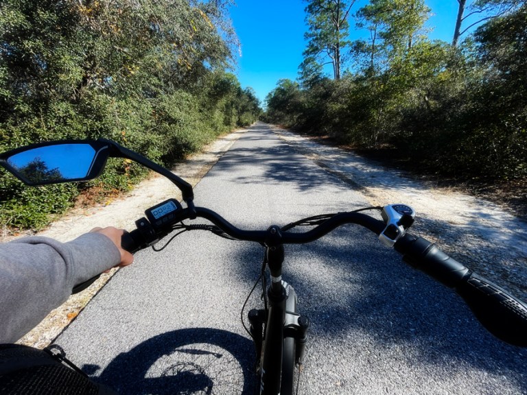 Daily morning sunrises from the deck and evening sunsets from the beach. Beach strolls with the pups and afternoons laying out. Plus the usual outlet mall shopping trip and nice dinners. This time we found a restaurant not far from the house that was wonderful! We went twice and will for sure be back on our next stay. And since we enjoyed it so much last time, we rented E-bikes again and rode through the state park. I jokingly told Stephen he should ask the guy if he remembered us. Stephen said, yeah right, he won’t. Then the first thing the guy said when we picked up the bikes was that he remembered us from last May. Didn’t expect that. We are becoming regulars in the Gulf Shores area I guess. 😀